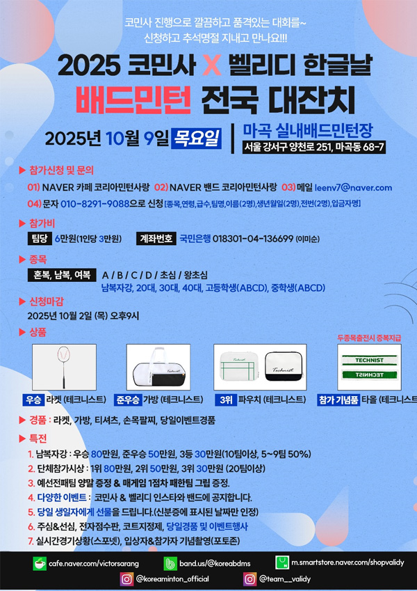 ◎ 대 회 : 2025 코민사×벨리디 한글날 배드민턴 전국 대잔치