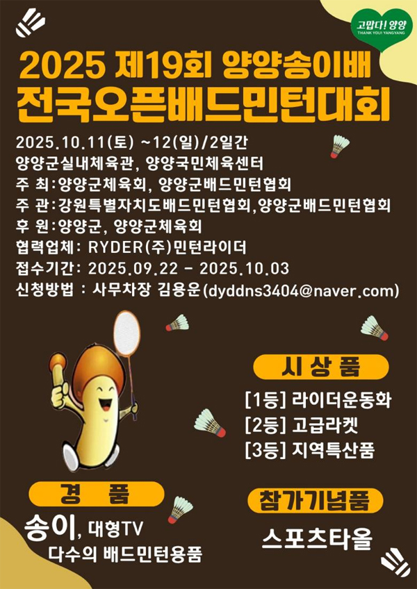◎ 대 회 : 제19회 양양송이배 전국 배드민턴대회
