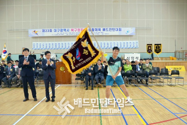 이어 전년도 종합우승을 차지했던 동산클럽의 회장이 대회 전통에 따라 우승기를 김익한 북구배드민턴협회장에게 직접 반환했고, 이는 새로운 대회의 시작을 알리는 상징적인 순간으로 큰 박수를 받았다. |