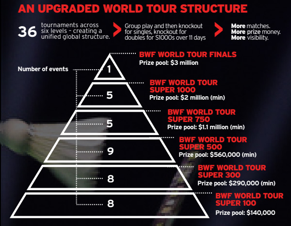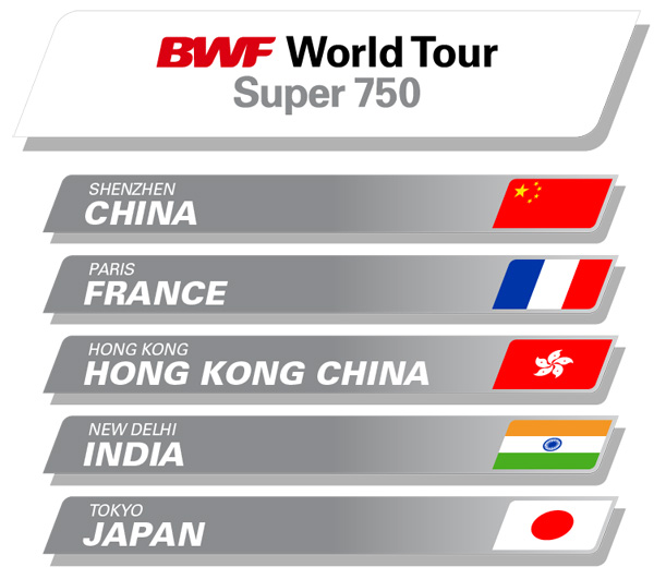 그 다음 등급인 슈퍼 750 대회는 중국마스터즈, 프랑스오픈, 홍콩오픈, 인도오픈, 일본오픈 등 5개 대회로 운영된다. 슈퍼 750 대회의 총상금은 110만 달러로 상향 조정됐으며, 경쟁력 있는 개최 도시와 안정적인 국제 중계를 바탕으로 월드투어의 상업적 가치와 흥행을 동시에 견인할 것으로 기대된다. |