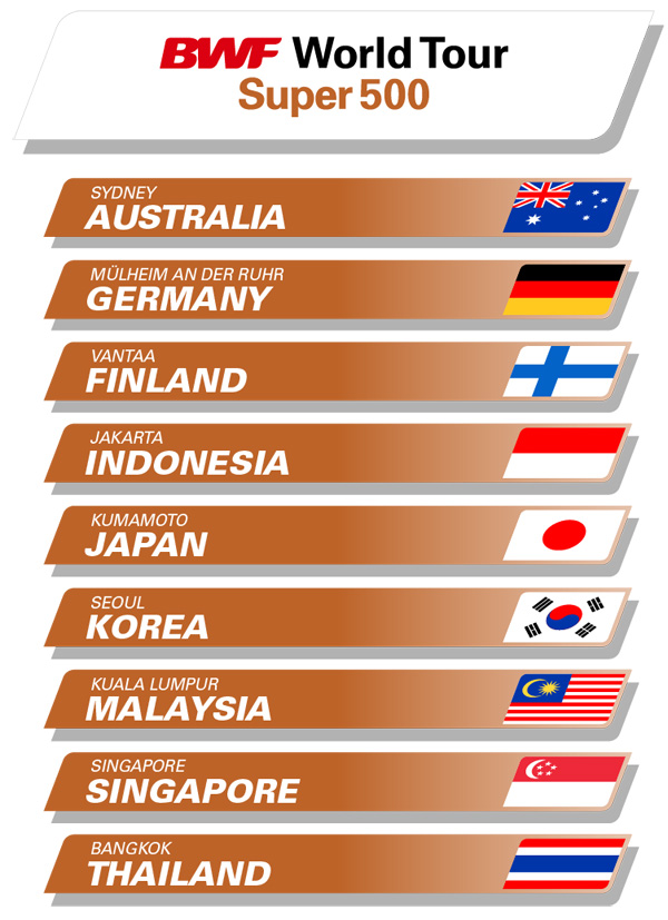 중상위 등급인 슈퍼 500 대회는 호주오픈, 독일오픈, 핀란드오픈, 인도네시아마스터즈, 일본마스터즈, 코리아오픈, 말레이시아마스터즈, 싱가포르오픈, 태국오픈 등으로 구성된다. 이들 대회는 각 대회당 총상금 56만 달러가 책정됐으며, 지역별 핵심 시장에서 배드민턴의 저변 확대와 선수들의 랭킹 경쟁에 중요한 역할을 하게 된다. |