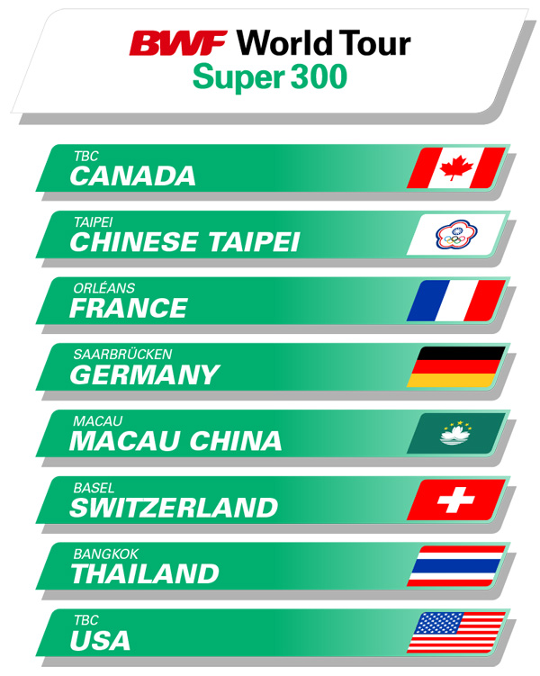 슈퍼 300 대회는 캐나다오픈, 대만오픈, 프랑스마스터즈, 독일마스터즈, 마카오오픈, 스위스오픈, 태국마스터즈, 미국오픈 등 8개 대회로 구성된다. 슈퍼 300 대회의 총상금은 29만 달러로 인상되었으며, 차세대 선수들의 성장 무대이자 지역 팬층 확대를 위한 전략적 거점 대회로 운영된다. |