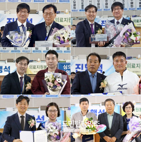 대구시배드민턴협회장 표창장은 대성클럽 김영철 회장과 신우클럽 박정렬 회장이, 협회장 공로상은 대성클럽 김장환 총무이사, 경일클럽 이덕현 경기이사, 희망클럽 이현주 총무이사가 각각 수상했다. |