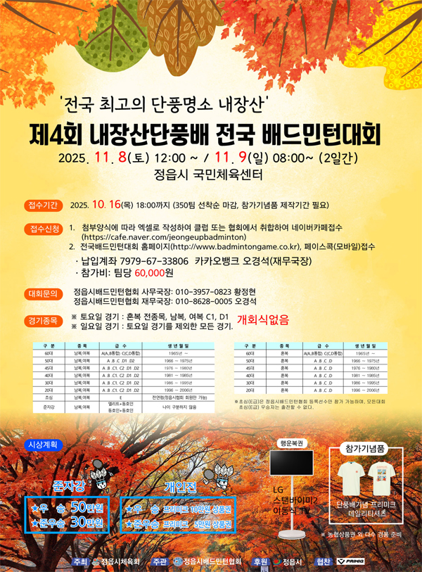 ◎ 대 회 : 제4회 정읍내장산단풍배 전국 배드민턴대회