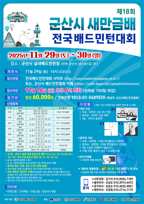 ◎ 대 회 : 제18회 군산 새만금배 전국 배드민턴대회
